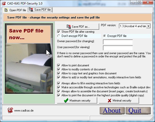 Protect PDF files against unauthorized access and encrypt them! The program limits the access to PDF documents. You decide if a PDF file can be printed in the Acrobat Reader or if somebody may copy or edit the text. You can decide if the user have to enter a password in order to view the file. It is also possible to decrypt PDF files. If they are protected by a password you have to know the password in order to decrypt the file.