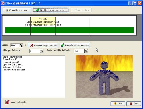 Erstellen Sie animierte GIF Dateien für Ihre Homepage aus AVI und MPEG Videos! Sie laden das Video, dann können Sie unliebsame Teile herausschneiden. Sie können auch die Auflösung und die Anzahl der Bilder Pro Sekunde fürs Internet optimieren. Schließlich speichern Sie das Ergebnis als GIF Datei, diese kann dann wie jedes andere Bild in Ihre Homepage eingebaut werden und zeigt Ihr Video innerhalb Ihrer Webseite. Der HTML Befehl für eine animierte GIF Datei lautet wie der für alle anderen Bilder: <img src="dateiname.gif"> Animierte GIF Dateien können quasi von jedem Browser angezeigt werden und benötigen keinerlei Plugins.