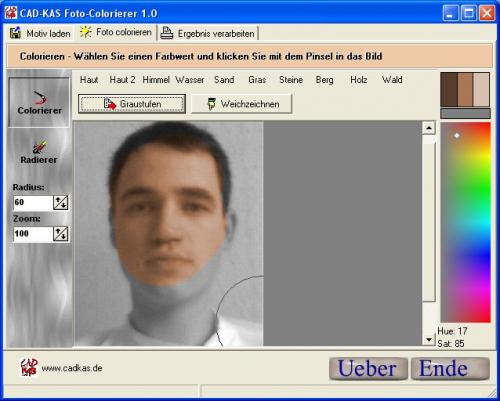 Haben Sie auch noch einen Stapel alter Schwarz/Weiß Fotos herumliegen? Mit dem Programm können Sie diese nun selber ganz einfach kolorieren. Sie brauchen nur die Farben den Objekten im Bild zuzuordnen. Es gibt vordefinierte Farbeinstellungen für Haut, Himmel, Wasser, Sand, Gras usw. Sie können natürlich auch Farben in Farbfotos korrigieren oder austauschen. Zum Schluß können Sie das Bild auch noch ausdrucken und abspeichern. Das Programm erhält im Unterschied zu normalen Malprogrammen die Zugrunde liegenden Strukturen und Helligkeitswerte und verändert nur die Farbgebung der Objekte.